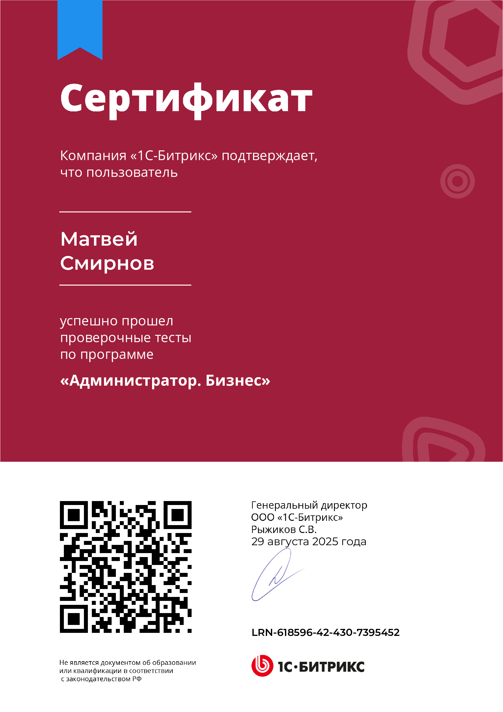 Проходил обучение с последующей успешной сдачей платного экзамена в 1С-Битрикс (наличие сертификата).